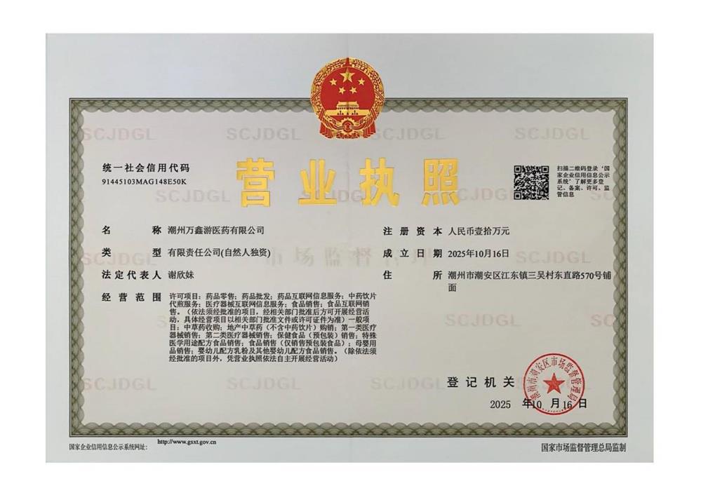 潮州万鑫游医药有限公司,企业注册地址位于潮州市潮安区江东镇三吴村东直路570号铺面。潮州万鑫游医药有限公司成立于2025年10月16日,法定代表人为谢欣妹,注册资本为10万元,统一社会信用代码为91445103MAG148E50K,企业注册地址位于潮州市潮安区江东镇三吴村东直路570号铺面,所属行业为科技推广和应用服务业,经营范围包含:生物技术的研发、推广;药品经营;食品销售;保健食品销售;餐饮服务;医疗器械经营;商务信息咨询;保健信息咨询;文化传播活动策划;销售及网上销售:农副产品,海产品,化妆品,洗涤用品,消毒用品,计生用品等。公司秉承“大众健康,我们的心愿”的经营理念,严把质量关,竭诚为广大客户提供优质的产品和服务。我们本着“开拓进取,互惠共赢,优质的服务”的企业精神,以规范、专业、创新、共赢的经营理念,在稳步发展的同时切实履行各种社会责任,树立可持续发展的奋斗目标。面向全国,服务社会,以人民利益为先,希望为人类健康事业做出更大的贡献。。